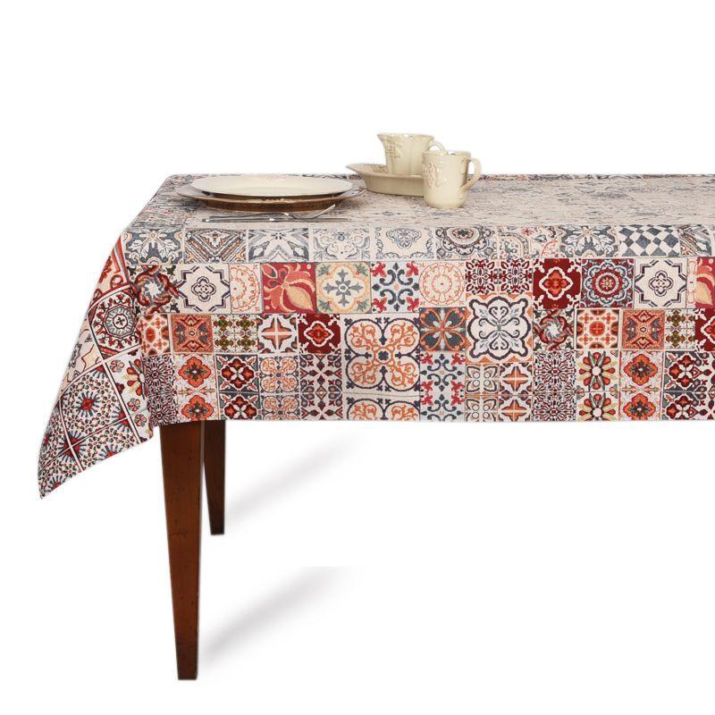 Малюнок гобелену стилізований під старовинні кам'яні кахлі, старі від часу. Сервірування столу в середземноморському стилі дуже гармонійно виглядатиме на скатертині. Тефлонове покриття надає виробу водовідштовхувальні властивості.